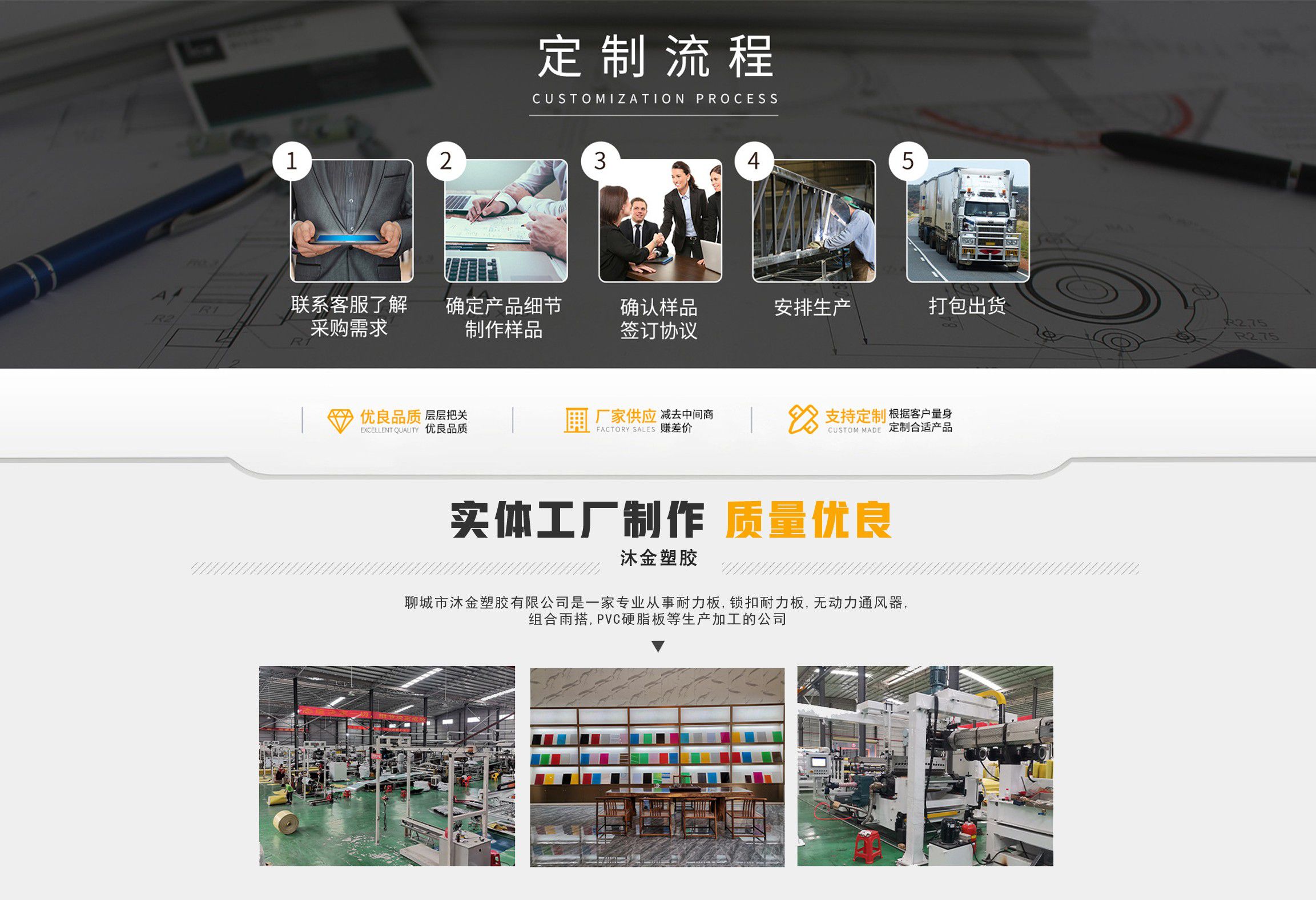 聊城市沐金塑膠有限公司注冊資金2180萬元,占地20000余平方,擁有自建廠房15000平方,員工100余名。10余年來,公司主營耐力板,鎖扣耐力板,耐力板深加工,無動力通風器,組合雨搭,PVC硬脂板,耐力板廠家等板材的發展戰略,逐漸成長為綜合性企業。 公司擁有多條板材共擠生產線,采用世界知名品牌進口原材料和先進工藝,依據完善的ISO9001質量管理體系和ISO14001環境管理體系,為產品的卓越品質提供了強有力的保證。憑借過硬的創新能力和堅實的硬件基礎,贏創已成為國內領先的熱塑性板材生產商,產品被廣泛應用于建筑業、農業、工業、廣告業、安防行業及DIY領域。 公司始終致力于通過提供最優的板材應用解決方案,為客戶創造最高的價值;堅守創新、質量、靈活、服務和速度的核心價值觀;堅持“完美的產品需要完美服務的支持”的經營理念,努力實現成為世界領先的板材與解決方案供應商的夢想?! ≡谖磥恚緦⒘⒆憧蛻粜枨螅粩喔淖兒屯晟片F有產品,拓展產品線和充分開發板材的應用領域,為客戶創造全方位的價值。同時更好地實現員工的價值,實現公司團隊的價值。我們將與您一起創贏未來! 企業使命:成為世界領先的板材與解決方案供應商?! 」驹妇埃和ㄟ^提供最優的板材應用解決方案,為客戶創造最高的價值。 核心價值觀:質量...